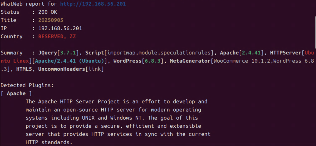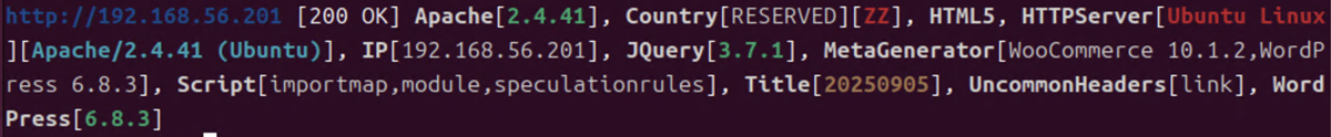http://192.168.56.203 [200 OK] Apache[2.4.41], Country[RESERVED][ZZ], HTTPServer[Ubuntu Linux][Apache/2.4.41 (Ubuntu)], IP[192.168.56.203], Title[Apache2 Ubuntu Default Page: It works] http://192.168.56.201 [200 OK] Apache[2.4.41], Country[RESERVED][ZZ], HTML5, HTTPServer[Ubuntu Linux][Apache/2.4.41 (Ubuntu)], IP[192.168.56.201], JQuery[3.7.1], MetaGenerator[WooCommerce 10.1.2,WordPress 6.8.3], Script[importmap,module,speculationrules], Title[20250905], UncommonHeaders[link], WordPress[6.8.3]