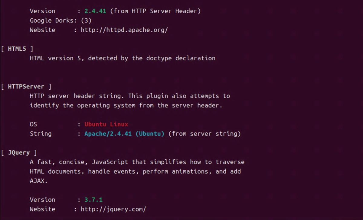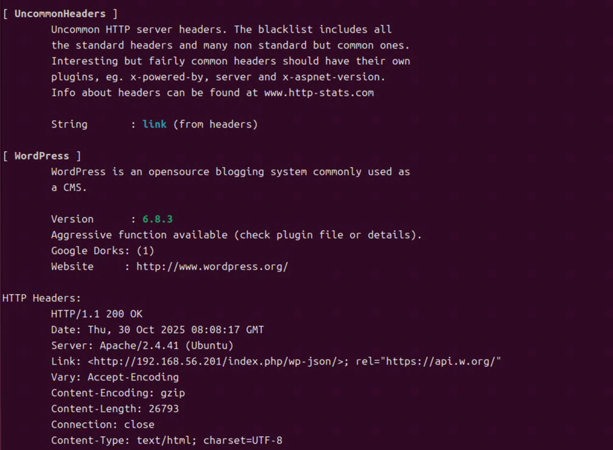 http://192.168.56.201 [200 OK] Apache[2.4.41] # webサーバの種類,バージョン Country[RESERVED][ZZ] # どこの国のIPアドレスなのか HTML5 # ページが何で書かれているか HTTPServer[Ubuntu Linux] [Apache/2.4.41 (Ubuntu)] # OS,使用しているソフト IP[192.168.56.201] JQuery[3.7.1] # 使用されているJavaScriptライブラリ MetaGenerator[WooCommerce 10.1.2,WordPress 6.8.2] # CMSに導入されているプラグイン Script[importmap,module,speculationrules] # スプリクトタグの属性や種類 Title[20250905] # ページのタイトル UncommonHeaders[link] # 標準的ではないHTTPヘッダの情報 WordPress[6.8.2] # 使用されているCMS