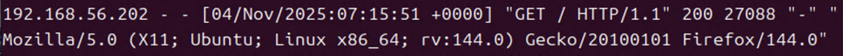 [スキャン実行サーバにて] whatweb -U "Mozilla/5.0 (X11; Ubuntu; Linux x86_64; rv:144.0) Gecko/20100101 Firefox/144.0" http://192.168.56.201 # -U : user-agentを指定 # user-agent文字列には、firefoxから通常アクセスした時のものを使用した